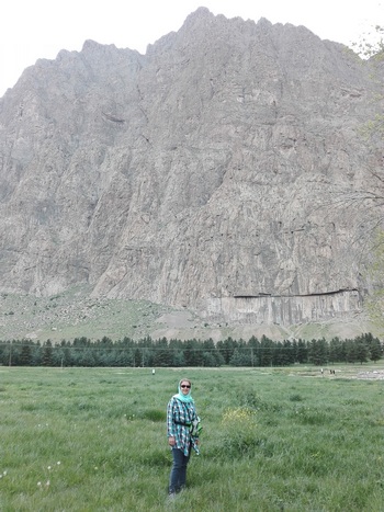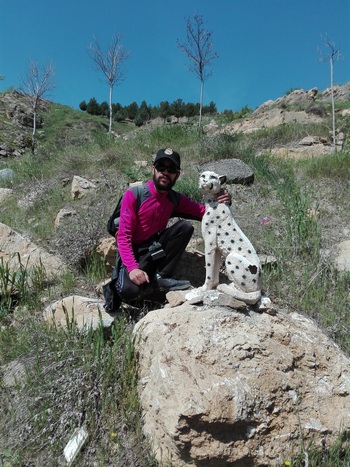 مشتاق در کنار تندیس پلنگ پایین گور دخمه