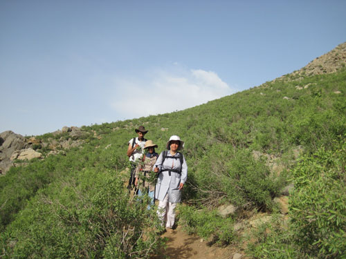 پس از ساعتی از مسیر نسبتا شیبدار به سنگهای صخره ای رسیدیم که شبیه سنگهای بیستون خشن و تیز بودند. حدود یک ساعت دست به سنگ رفتیم تا به محوطه ای به نام «گاچال» که در پای زین کوه واقع شده بود، رسیدیم. بعد از عبور از آن همه صخره های خشن ناگهان با فضای سرسبز و پر گلی روبرو شدیم که حقیقتا روح را نشئه تازه ای می بخشدید و مسیرش هم شیب ملایمی داشت.