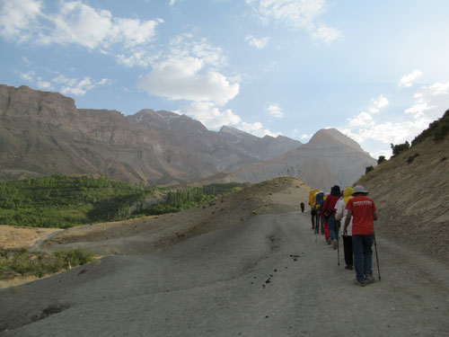 ساعت ۱۸:۳۰ساعت بعد از تقسیم وسایل و آماده کردن کوله ها بسمت پناهگاه حرکت کردیم.در انتهای روستا بعد از باغات، مسیر دوشاخه می شد یکی مسیر رودخانه که جاده اش خاکی بود و دیگری، راهی که باید از میان باغهای میوه می گذشتی. ما از مسیر سمت راست و از کنار رودخانه به راهمان ادامه دادیم. البته در ادامه دو مسیر یکی می شوند.تمام مسیر هم پاکوب بود.