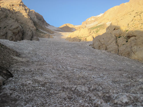 مسیر دره شیب تندی داشت البته برفش یخ نزده بود اما بعضی جاها آقای خسروانی با کلنگ جای پا درست می کردند و با صبوری هرچه تمام تیم را یاری می کردند. قله زیبای مورگل هر لحظه بیشتر نمایان می شد این کوه واقعا زیبا و با ابهت بود.