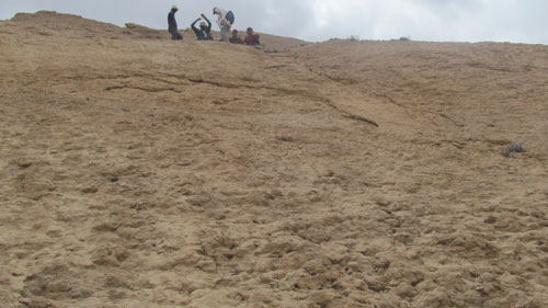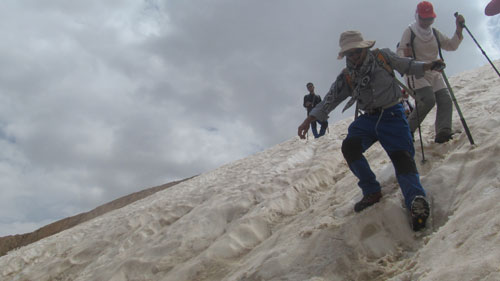 سطح یخ برف در آن صبح زود یخ زده و حرکت ما با توجه به نداشتن کرامپون بسیار مشکل و کند است کم کم با بالا آمدن خورشید و گرم شدن هوا سطح برفها کمی نرم شده و حرکت ما ساده تر می گردد