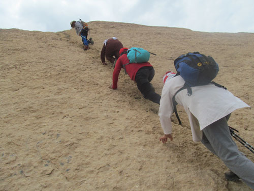 پس از یک ساعت توقف برای صبحانه بر روی شیب ملایم دره بالا می رویم . در انتهای دره شیب تندی وجود دارد . هنگامیکه عقربه های ساعت ۱۲ را نشان می داد ما بر روی قله قرار گرفتیم در مجموع ۶ ساعت از پناهگاه تا قله زمان برد