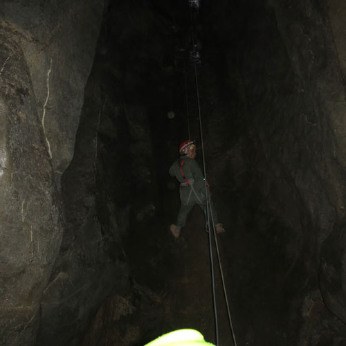 پس از تقریبا ۲ متر قائم به صورت پاندول در آمد که تا ۱۰ متری غار به همین ترتیب ادامه داشت که از یک کلاهک بسیار جالب تشکیل شده بود. پس از آن بقیه مسیر فرود به صورت کاملا پاندول تا انتهای غار که حدودا ۳۵ متر بود رسید. کف غار دارای خاکی نرم و مساحتی حدود ۶۰ متر مربع بود دارای هوایی کاملا مطبوع و دیواره های بسیار زیبا و دیدنی که عظمت غار را دوصد کرده بود، داشت. بر روی سنگهای کناری تعدادی خفاش و در بیشتر قسمتها مگسهایی که فاقد چشم بودند و سخت خود را سنگ چسبانده بودند، مشاهده کردیم.