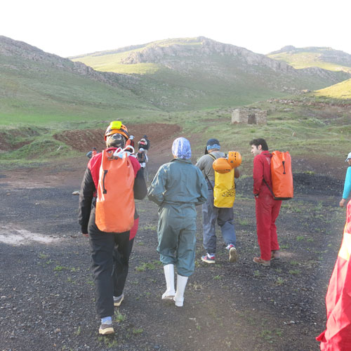 پس از جابجا نمودن وسایل ابتدا آقایان مفاخری و برومند جهت بستن کارگاه وارد غار شدند و بعد از آماده شدن بقیه افراد به ترتیب رفتیم