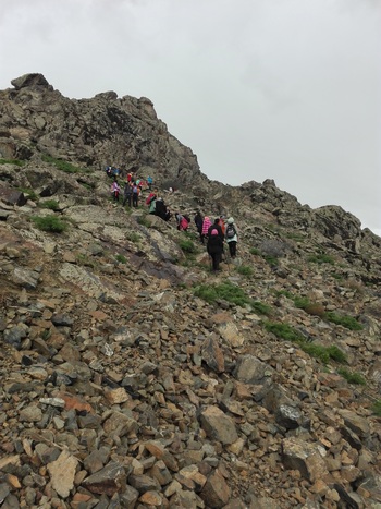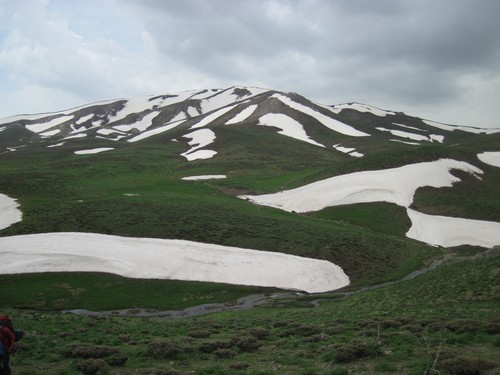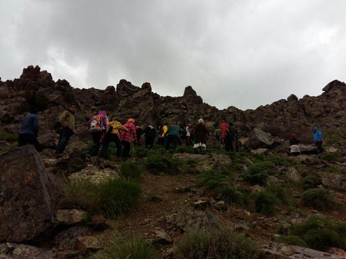با شروع رعد و برقی بسرعت بسمت شرق که ابرهای کمتری داشت رفتیم در بین مسیر همنوردمان مهدی عباسی از همه همنوردان خواست اشیا فلزی را از خود دور کنند تا دچار صاعقه زدگی نشویم خوشبختانه رعد و برق خیلی طول نکشید و ما بسمت بالا رسیده و با دور زدن و پبمایش دو قله فرعی بسمت پارک ماشین ها رفتیم.